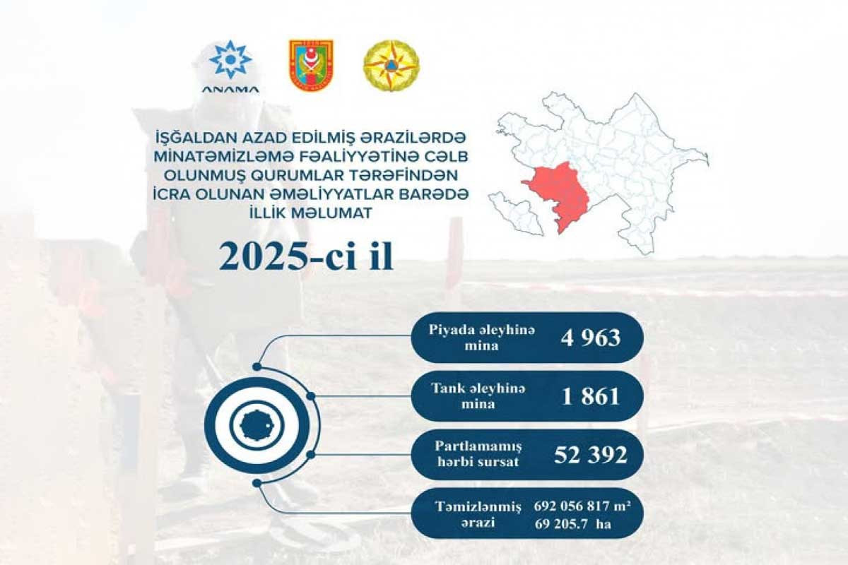 İşğaldan azad edilmiş ərazilərdə minatəmizləmə fəaliyyətinə cəlb olunmuş qurumlar tərəfindən 2025-ci il üzrə icra olunan əməliyyatlar barədə məlumat açıqlanıb.