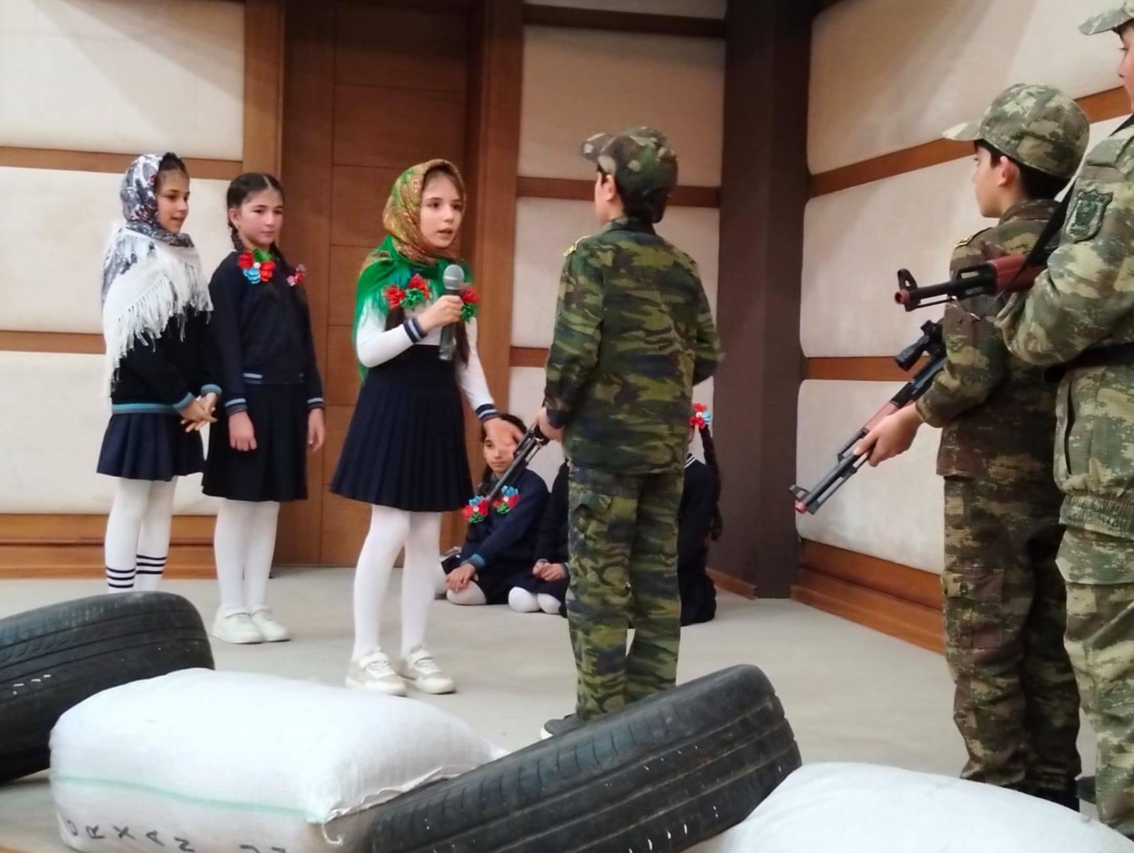 Tədbirin bədii hissəsində məktəblilərin ifasında səslənən şerlər və mahnılar, nümayiş olunan səhnəciklər tədbirə bir qəhrəmanlıq, vətənpərvərlik ovqatını qatdı.