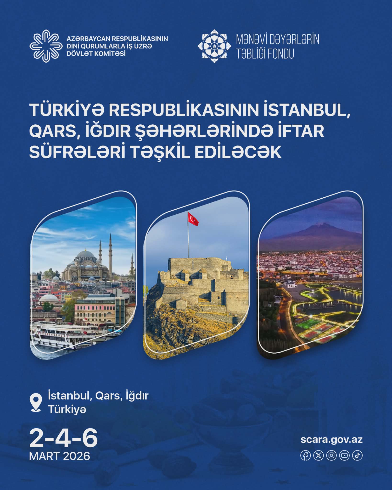 Dini Qurumlarla İş üzrə Dövlət Komitəsi və tabeliyində fəaliyyət göstərən Mənəvi Dəyərlərin Təbliği Fondunun təşkilatçılığı ilə 2–6 mart tarixlərində Türkiyə Respublikasında yaşayan azərbaycanlı soydaşlarımız üçün İstanbul, Qars və İğdır şəhərlərində Ramazan ayı münasibətilə iftar süfrələri təşkil olunacaq.