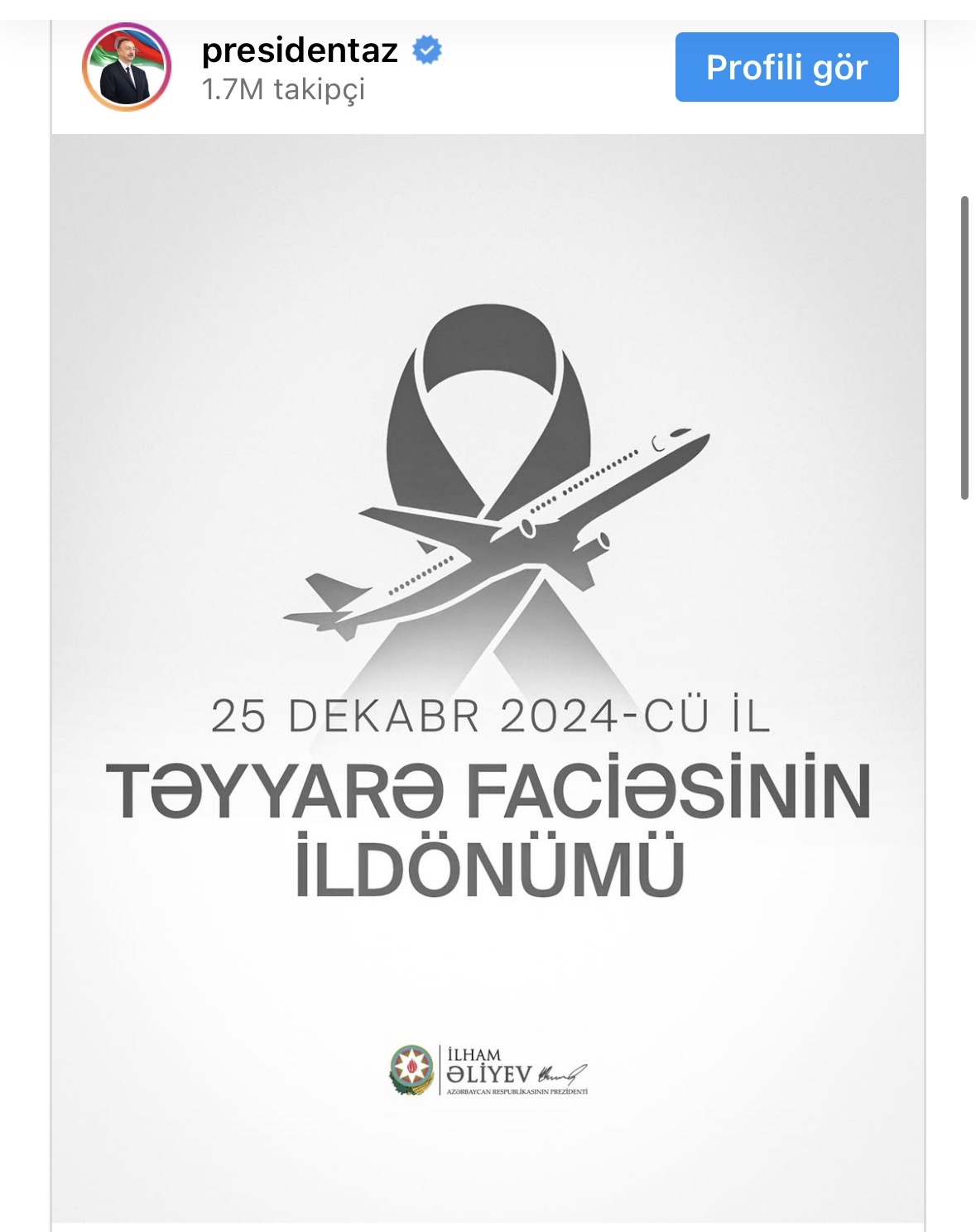 Prezident İlham Əliyev AZAL təyyarəsinin Qazaxıstanda qəzaya uğramasının ildönümü ilə bağlı paylaşım edib Siyasət 08:28 735 Prezident İlham Əliyev AZAL-a məxsus sərnişin təyyarəsinin Qazaxıstanda qəzaya uğramasının ildönümü ilə bağlı paylaşım edib. Paylaşımı təqdim edirik:
