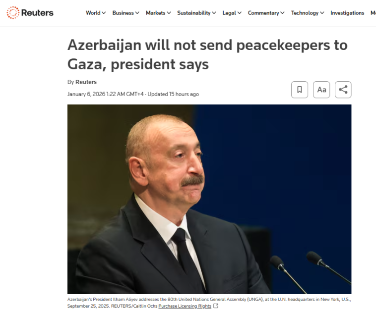 AZƏRTAC-ın xəbərinə görə, nüfuzlu “Reuters” agentliyinin, ABŞ-ın “US News”, “The Straitstimes”, “Econotimes” qəzetlərinin, “Global Banking and Finance” internet resursunun, habelə beynəlxalq analitik portal olan “Al-Monotor”un dərc etdiyi “Azərbaycan Qəzzaya sülhməramlı kontingent göndərməyəcək” sərlövhəli xəbərlərdə qeyd olunur ki, Prezident İlham Əliyev Azərbaycan hərbçilərinin ölkənin hüdudlarından kənarda heç bir hərbi əməliyyatlarda iştirak etmədiyini və bunun gələcəkdə də nəzərdə tutulmadığını bildirib. Materialda bununla bağlı yanlış məlumatları təkzib edən dövlətimizin başçısının sözləri sitat gətirilir: “Biz 20 sualdan ibarət müraciət tərtib etdik və onu Amerika tərəfinə çatdırdıq. Bu məsələlərə aydınlıq gətirilməyincə, Azərbaycanın hər hansı missiyada heç bir iştirakı nəzərdə tutulmur”.