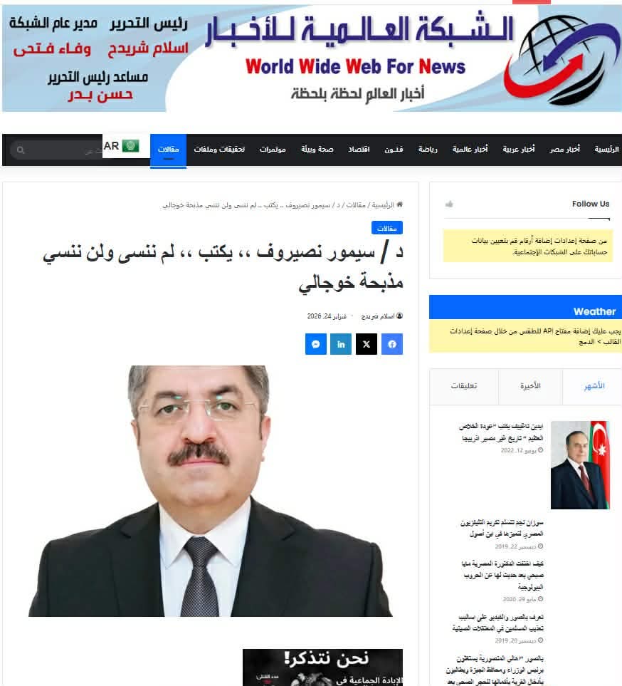 Misir, Əlcəzair, İraq, Süriya və.s ərəb ölkələri mediasında Azərbaycan-Misir Dostluq Cəmiyyətinin İdarə Heyətinin sədri, tədqiqatçı-alim Seymur Nəsirovun Xocalı soyqırımının 34-cü ildönümü ilə bağlı məqaləsi dərc olunub.