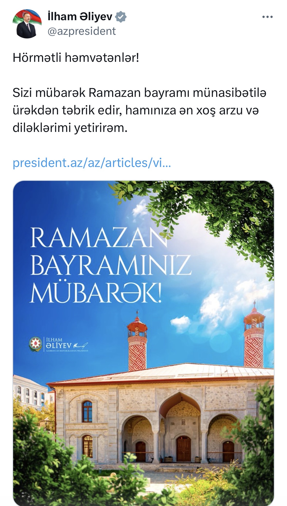 Prezident İlham Əliyevin sosial media hesablarında Ramazan bayramı münasibətilə paylaşım edilib
