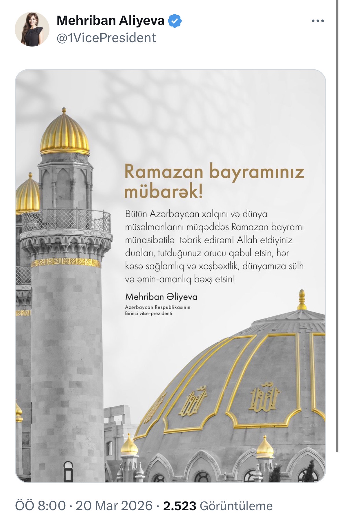 Mehriban Əliyeva Ramazan bayramı münasibətilə Azərbaycan xalqını təbrik edib
