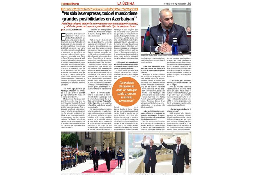 İspaniyanın "LA ÚLTIMA" qəzetində ölkəmizə həsr olunmuş "Azərbaycanda nəinki biznes üçün, hər kəsin böyük imkanları var" başlıqlı müsahibə dərc olunub.