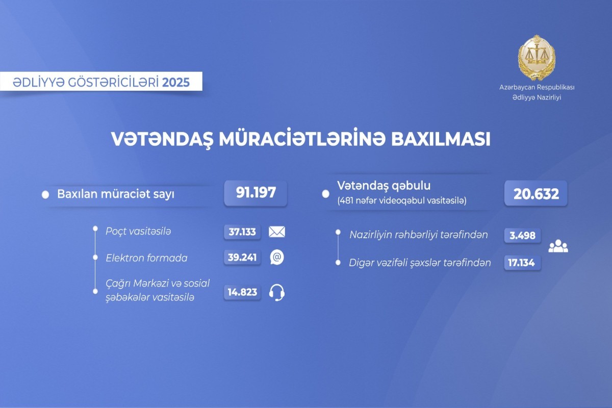 2025-ci il ərzində Ədliyyə Nazirliyinin Aparatında vətəndaşlar tərəfindən ünvanlanmış 91.197 müraciətə qanunvericiliyin tələblərinə uyğun olaraq baxılıb.