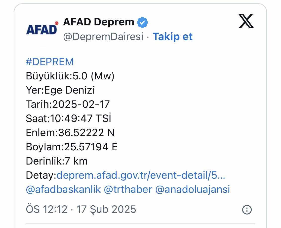 Egey dənizində 5 bal gücündə zəlzələ Dünya 17 Fevral 2025 12:31 2 128 Egey dənizində 5 bal gücündə zəlzələ baş verib. Türkiyənin Fövqəladə Halların İdarə Olunması Agentliyindən (AFAD) verilən açıqlamada baş verən zəlzələnin 5 bal gücündə və 7 kilometr dərinlikdə olduğu bildirilib.